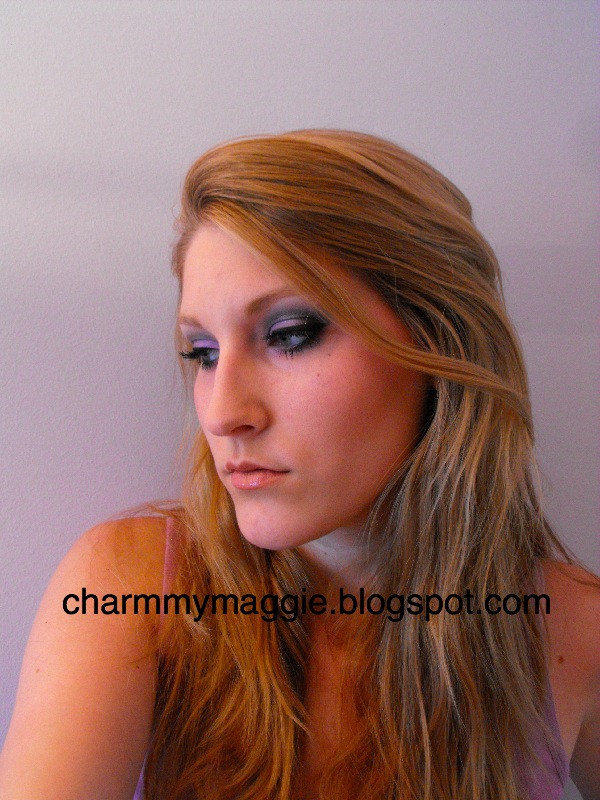 Ha megvagyok az alapozással, én általában azonnal a szememre térek át, és amikor az kész, utána púderezek. Kontúr, pirosítás. Itt figyeljünk oda, hogy a színeket mindig dolgozzuk szépen össze, nagyon hülyén tud kinézni, ha kétféle szín mint egy-egy csík van egymás alatt.. (azért írom ezt most le, mert tegnap láttam egy lányt aki úgy gondolta, hogy ez így neki megfelel, és nagyon bután nézett ki vele..) És ezután, mivel lilás sminkünk van, arra gondoltam, hogy highlighternek is egy lilás színt választok. Nyilván nem lesz ez egy erős lila sőőt.., csak hogy azért a szemünk és az arcunk harmonizáljon valamennyire:)