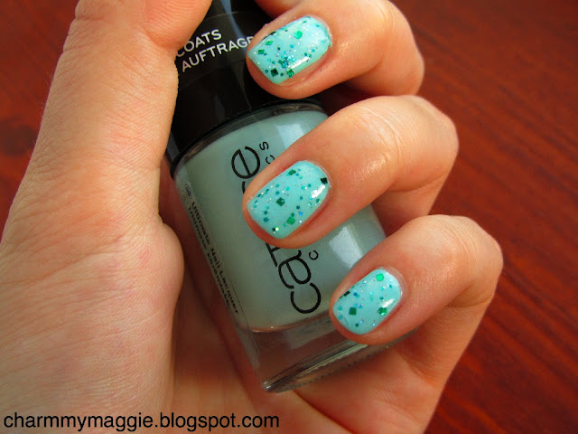 Az essence glitteres fedőlakk pedig szerelem volt első látásra, amit mindenképpen be kellett szereznem. Arra gondoltam, hogy jól mutathatnak együtt ezzel a türkizes alappal. Először csak a gyűrűs ujjamra tettem a glitterekből, de aztán végülis úgydöntöttem, hogy teszek mindegyikre, ki kellett próbálni:)