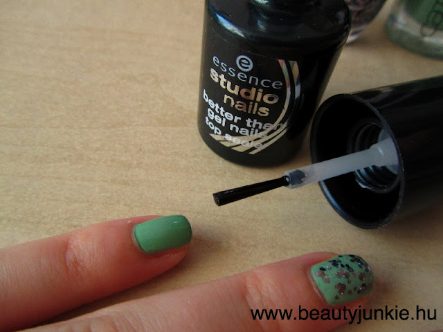 Amikor végeztem a díszítéssel, akkor végigmegyek az összes körmömön az essence better than gel nails fedőlakkal: