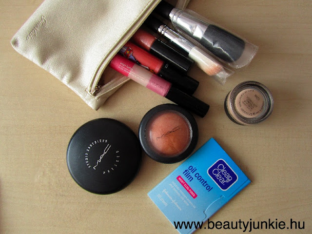 A kicsibe pedig a korrektor, púder+ecset, pirosító+ecset és a szájfények. Ezek mellé betettem a Clean&Clear mattító filmet.