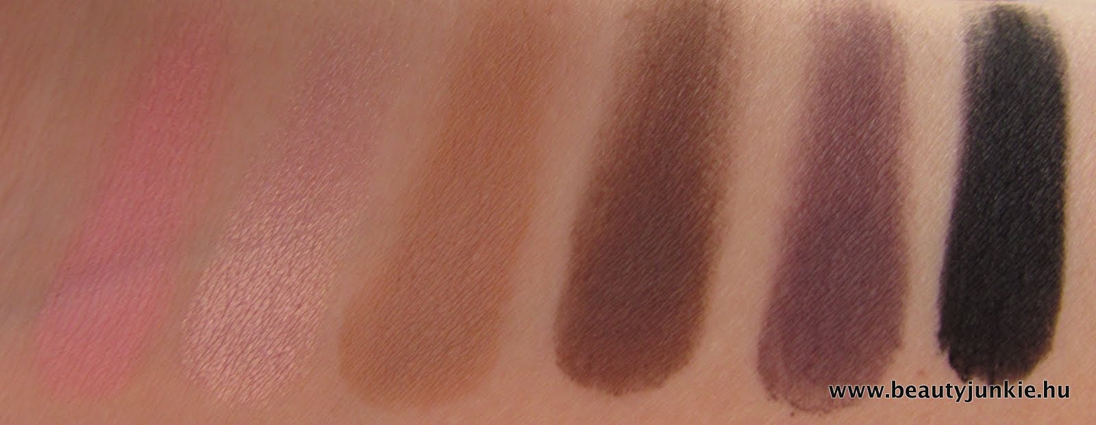 A színek felülete domború mintás, ami valószínűleg hamar lekopik, de nem is bánom, nekem annyira nem tetszik. A palettában matt illetve szaténfényű színeket találhatunk, és abszolút mindegyik az én ízlésemnek megfelelő, mert nagyon szép hétköznapi sminkeket képzeltem már el vele:) (persze bulisakat is, csak azt nincs hová ugye:D) Az állaguk is különböző, a mattak kicsit keményebbek és porzósabbak, a fényesek inkább krémes jellegűek. Mindegyik pigmentáltságával meg vagyok elégedve, igazából várakozáson felül teljesítettek nálam:)