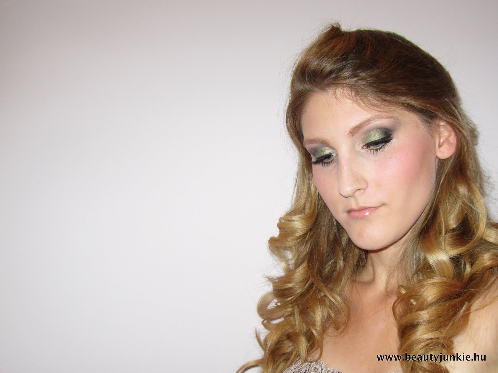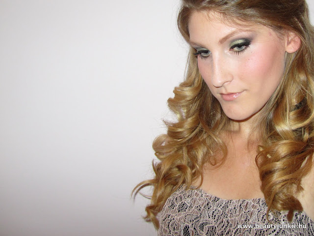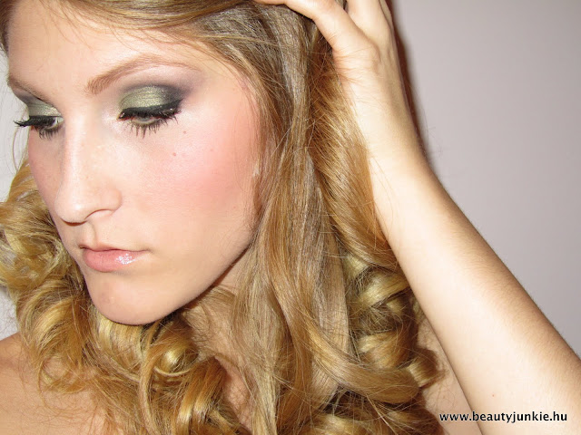 A szememre, mint már írtam, valami zöldet képzeltem el, ehhez feltettem egy zöldes feketés alapot, beleütögettem a pigmentet, majd matt feketével mélyítettem és egy bőrszínnel eldolgoztam a széleit. Egy kis arany fényű pigment került a szemzugba és a szemöldökcsontra. Vastag tusvonal került még fel és szempillaspirál jó bőven. Gondolkodtam a műszempillán, fel is tettem az egyik szememre, de nem volt olyan látványos a változás, úgyhogy inkább levettem, hogy ne aggódjak ezen egész este:)