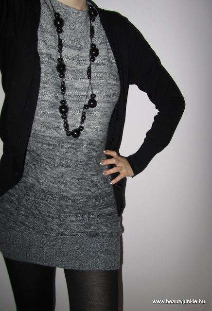 A mai outfit pedig, egy kötött színátmenetes ruha, kardigánnal és egy fekete bogyós nyaklánccal, plusz egy fekete magasszárú csizmával: