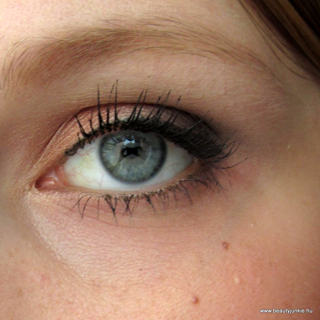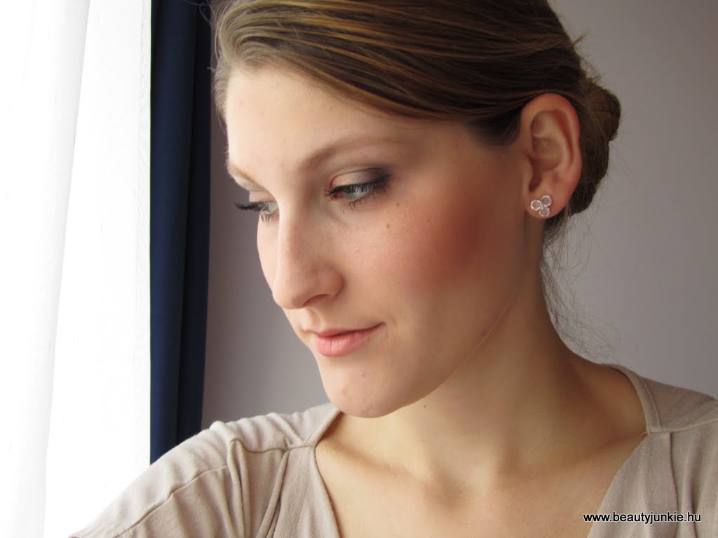 Nagyon szeretem a MAC All that glitters nevű szemhéjpúderét, szerintem simán el fogom érni a pan-t is, akármennyire próbálok más színeket is használni gyakran, mégis ez az egyik kedvencem. Gyönyörű színe van! Most egy mineralized szemhéjpúderrel kombináltam, méghozzá a Smoked Rubyval, aminek gyönyörű bordó fénye van, de ezt sajnos ezek a buta fények nem tudják visszaadni:( Majd szerintem legközelebb vakuval is próbálkozom, mert élőben nagyon jól nézett ki együtt ez a két árnyalat 🙂 Ezek mellé egy vékony tusvonalat és egy barackos pirosítót és rúzst párosítottam, nekem ez így bőven elég a hétköznapokra 🙂