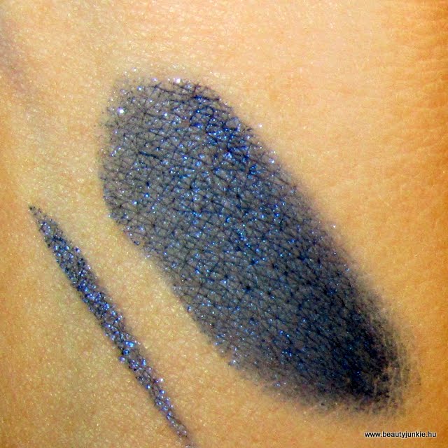 Kinyitva egy gyönyörű kék szín fogadott, ami a benne lévő királykék mikro csillámoknak köszönhető. Gyönyörű:) Az állaga egyik meglévő tusomra sem hasonlít, az Essence-hez képest jóval keményebb, de nekem jobban is tetszik. Lehet vele szép egyenletes vonalat húzni, nincs gond a pigmentáltsággal. Most lehet kapni ferde ecsetet is, és azt is ajánlom, a minták azzal készültek. Nagyon jól kézre esik és könnyű vele szépen dolgozni. El tudom képzelni alapnak is, mert nagyon szép szín!! Esti sminkekhez csodás lehet!