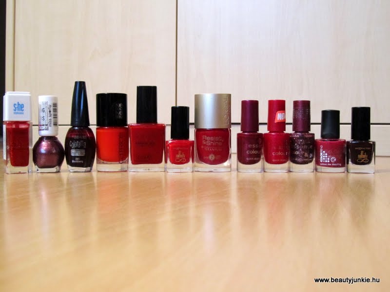 A pirosakat és bordókat egy kalap alá vettem most, az egyszerűség kedvéért. Imádom a meggy színű lakkokat, ezeket főleg a lábamon szeretem, szerintem nagyon dögös. Elég keveset mutattam nektek élesben ezek közül, de tulajdonképpen, amiket mutattam mindet gyakran használom. A Blackberry a kedvencem, ősszel teljesen rá voltam kattanva, ha most választanom kéne ezek közül egy kedvencet, ezt mondanám.