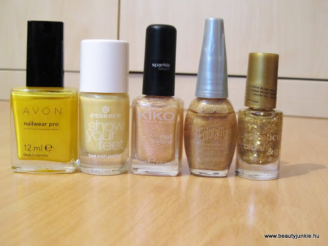 Ezek közül nincs sok, a sárgából csak egy élénk és egy halvány, az aranyak közül pedig összesen 3 darab van, de igazából mindegyiket szeretem valamiért. Kedvencet nem tudnék megnevezni, mind máshogy szép. A halvány sárgát még mindenképpen meg fogom mutatni, most tavaszra nagyon jó kis szín!