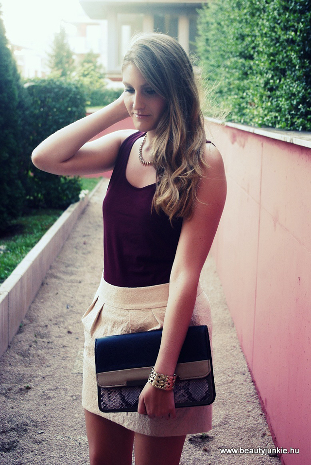 Tegnap este végre én is eljutottam bulizni! Ennek örömére meg is örökítettük, hogy miben mentem, semmi extra igazából, burgundi top, nude szoknya és arany kiegészítők, valamiért viszont különösen jól éreztem magam így! Megkaptam már, hogy ez a szoknya nem előnyös nekem, de én akkor is imádom, és szuperül érzem benne magam, éljenek a nőies formák! 🙂